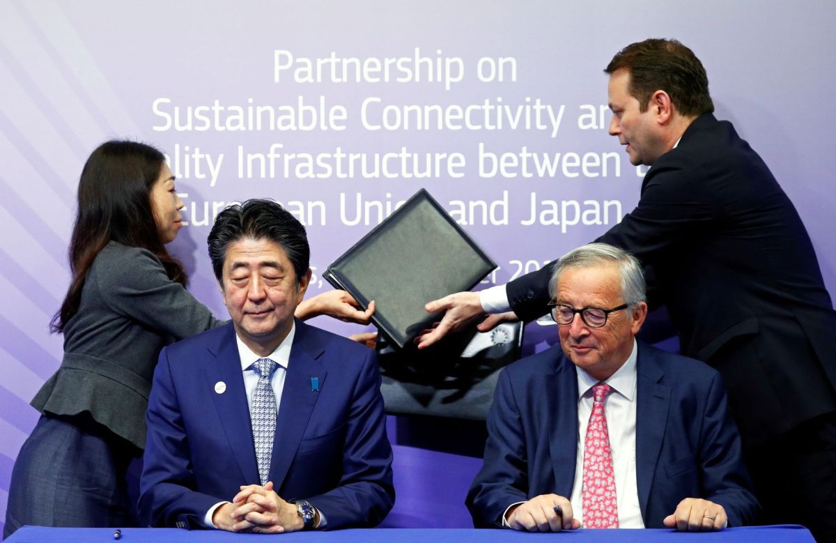 وقع رئيس الوزراء الياباني شينزو آبي ورئيس المفوضية الأوروبية جان كلود يونكر الاتفاق لتنسيق مشاريع البنى التحتية والنقل والمشاريع الرقمية التي تربط بين أوروبا وآسيا.