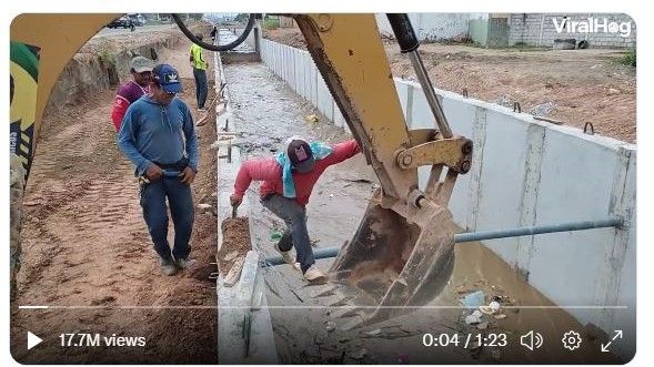 ويظهر الفيديو المنشور في التغريدة، عدد من العمال يقفون على حافة مجرى مياه سريعة، ثم ركب أحدهم ذراع جرافة، وتم إنزاله تدريجيا إلى أن لامس سطح المياه.
