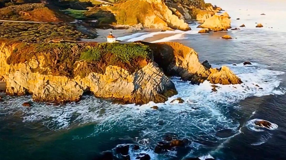12- منظر من طائرة بدون طيار للأمواج التي تتحطم على شاطئ منحدر.