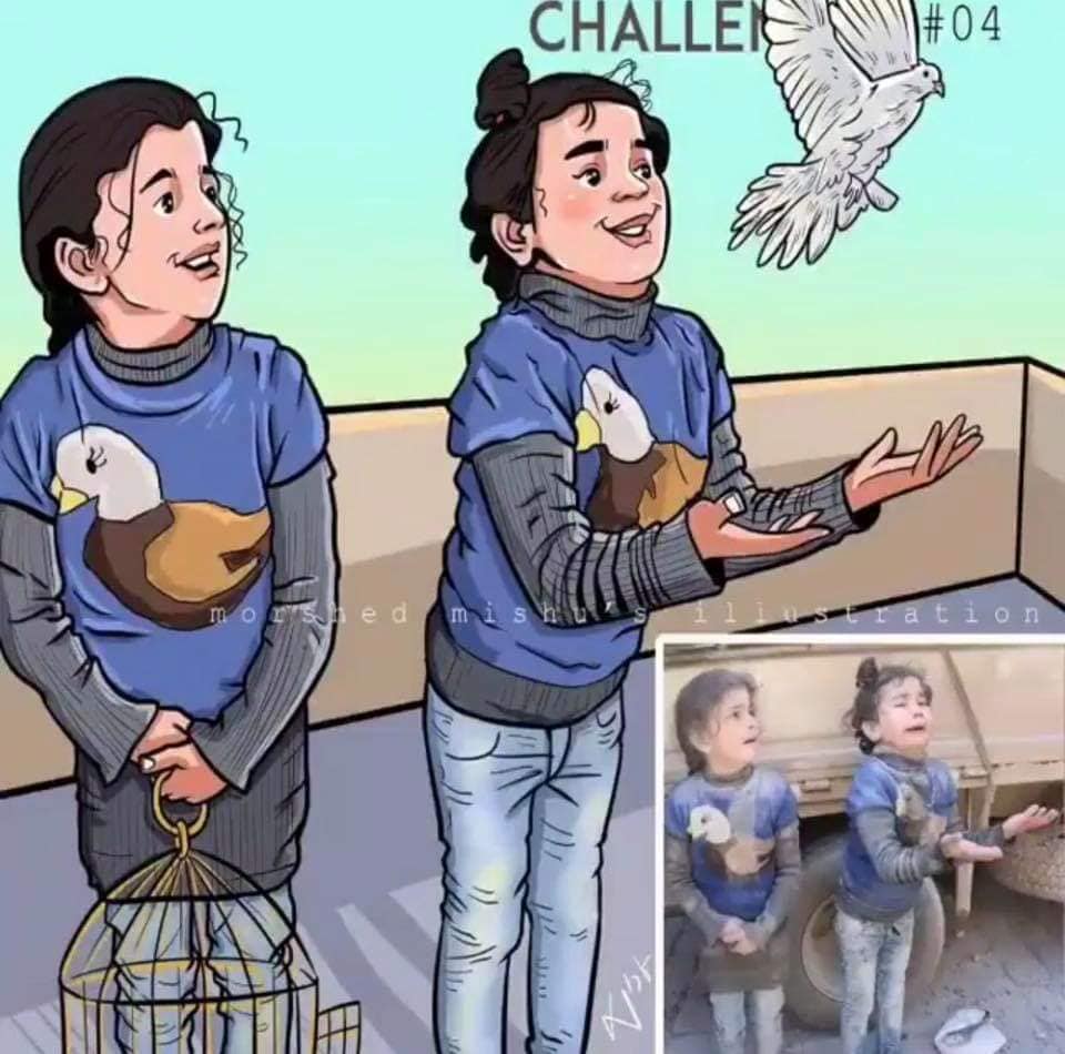 وقام الرسام أيضاً بإعادة تخيّل صورة الطفل السوري عمران التي تم تداولها بكثرة.