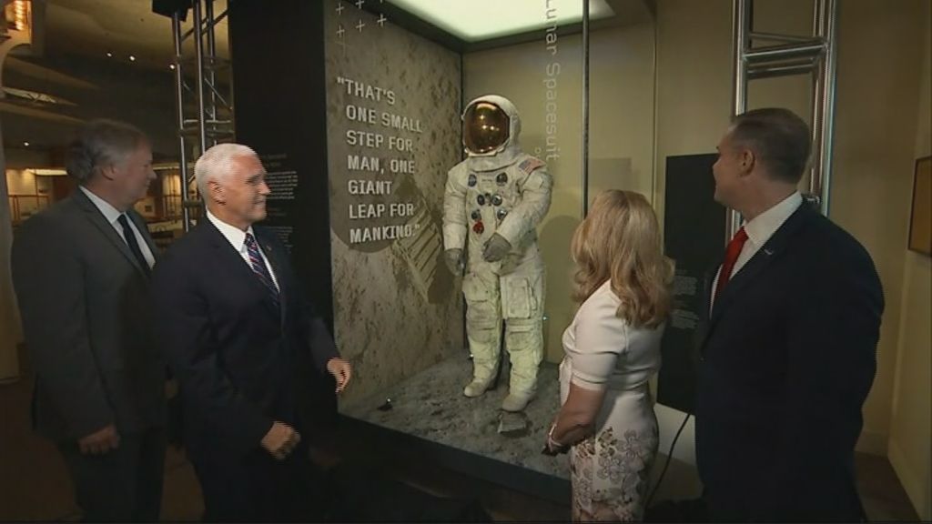 وشارك مايك بنس نائب الرئيس الأمريكي وريك آرمسترونغ ابن نيل باحتفالية رفع الستارة عن البزة بمناسبة اليوبيل الذهبي للرحلة.