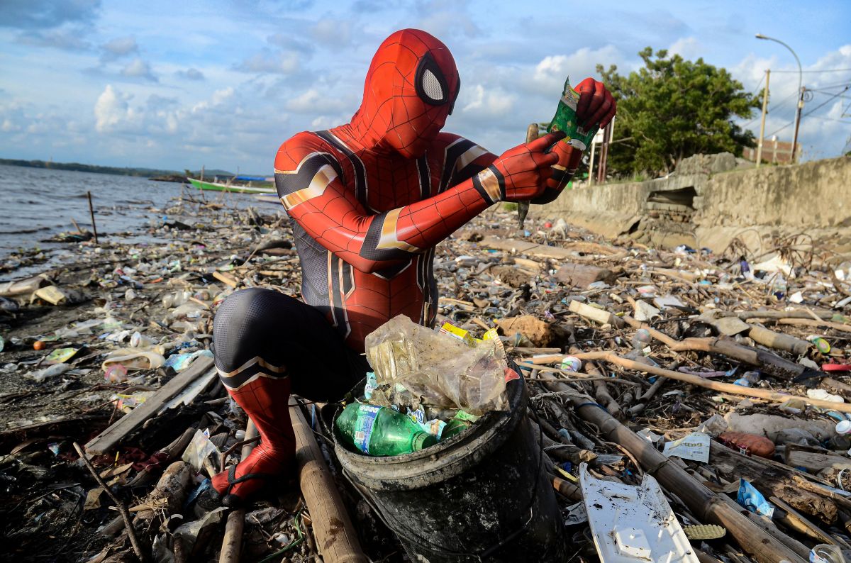 اليوم، هو “بطل خارق” يرتدي زي الرجل العنكبوت وهو يمر عبر المجاري والشواطئ والشوارع لتنظيف القمامة المصنوعة في الغالب من البلاستيك.