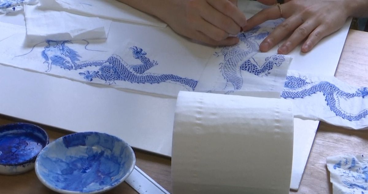 جسدت “هوي” الفن الصيني التقليدي على ورق التواليت باللون الأزرق، نقشت التنين والعنقاء بدقة على المناديل الورقية.