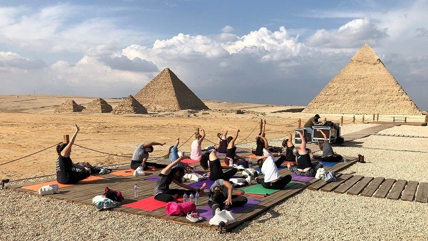 “كنت أرتعش في البداية”… هكذا قالت مدربة اليوغا ديالا جمال الدين بعد أن أدارت جلسة تدريب لنحو 200 شخص أمام أهرام الجيزة عند الغروب.