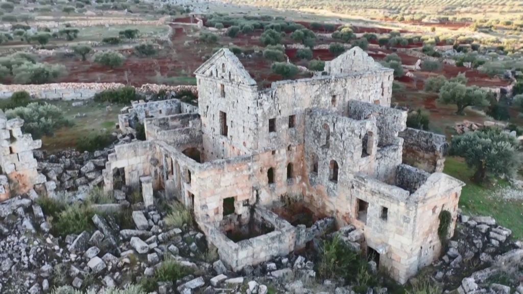 مشاهد طائرة درون لمواقع أثرية قديمة تعود إلى أواخر العصور القديمة والعصر البيزنطي من بينها قرى وكنائس وأديرة في محافظة إدلب في شمال غرب سوريا تضررت بشدة من الحرب الشرسة التي دامت 10 سنوات في سوريا.