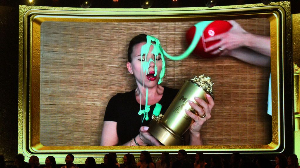تم تكريم النجمة “سكارليت جوهانسون” بجائزة الجيل. لم تحضر “جوهانسون” الحفل لكنها تسلمت الجائزة عبر الفيديو، الذي سرعان ما قاطع زوجها “كولين جوست” حديثها ، الذي ظهر في الإطار وشرع في إلقاء اللزج الأخضر عليها.
