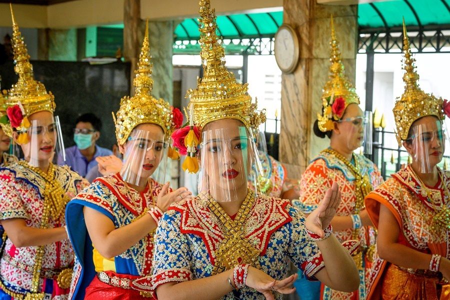 ارتدت بعض من الراقصات في تايلاند , لباسا تقليديا و و ضعن دروعا واقية للوجه في معبد إيراوان ، احتفالا بإعادة فتحه, بعد أن خففت الحكومة التايلاندية من التدابير لمكافحة انتشار فيروس كورونا المستجد.
