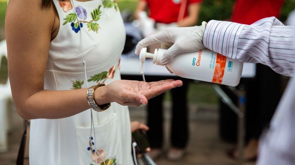 صورة تظهر شخصاً يضع معقم اليدين في يد شخص آخر. المصدر: getty