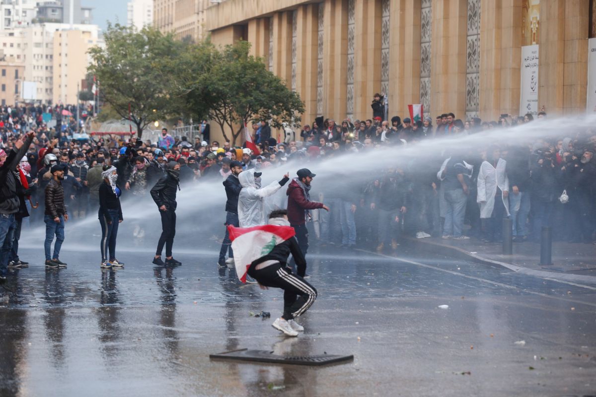 المتظاهرون يتعرضون لضرب مدفع المياه أثناء الاحتجاجات في بيروت، لبنان