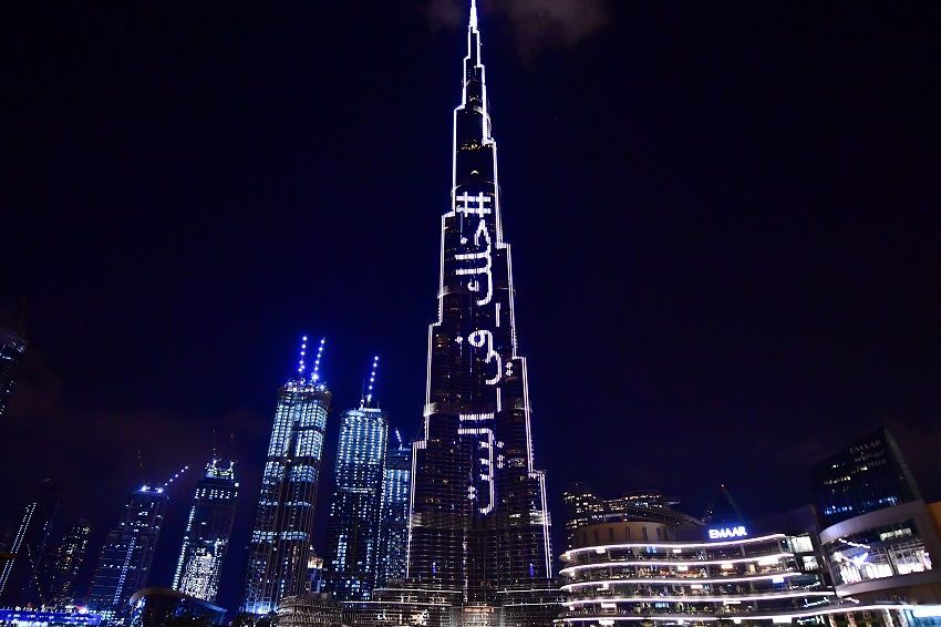 وفي دبي، اكتسى برج خليفة، بعبارات “خليك في البيت”، في إطار حض المواطنين على البقاء في منازلهم للوقاية من فيروس كورونا ووقف انتشاره.