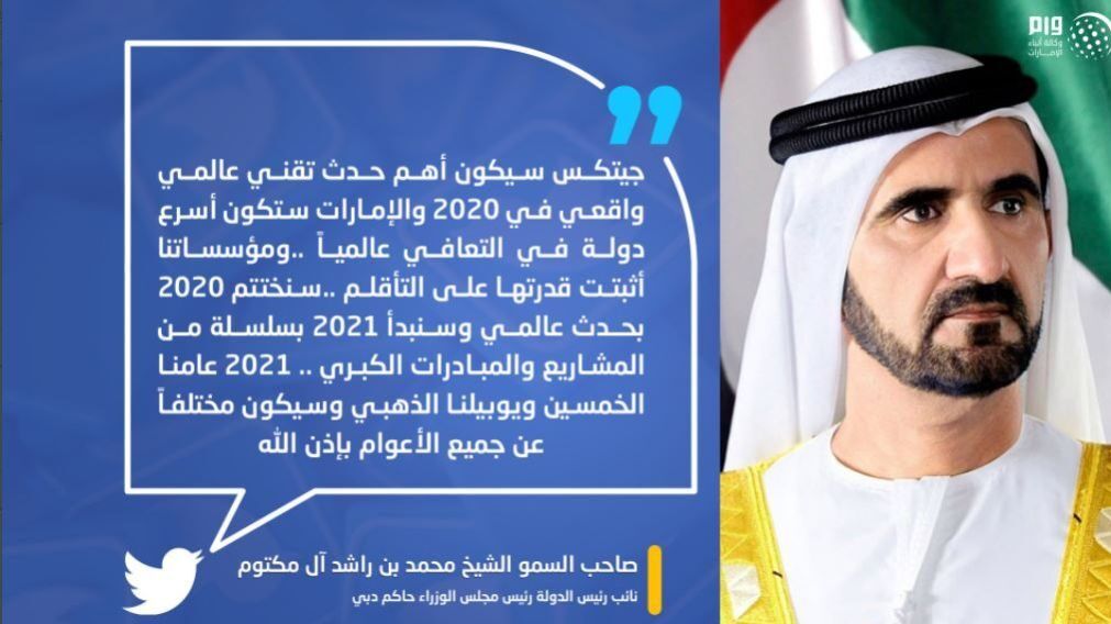 أعلن الشيخ محمد بن راشد آل مكتوم، نائب رئيس دولة الإمارات العربية المتحدة رئيس مجلس الوزراء، وزير الدفاع وحاكم إمارة دبي أن معرض جيتكس سيكون أهم حدث تقني عالمي واقعي في 2020 مضيفا أن دولة الإمارات ستكون أسرع دولة في التعافي عالمياً، وأشار إلى أن مؤسساتها أثبتت قدرتها على التأقلم قائلا في تغريدة على تويتر : “سنختتم 2020 بحدث عالمي وسنبدأ 2021 بسلسلة من المشاريع والمبادرات الكبري”
