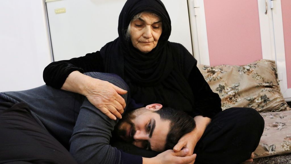 فرمان جلال يقبل رأس والدته، مهاجر كردي عراقي سجل طواعية للإجلاء من مينسك إلى العراق بعد محاولته العبور إلى الاتحاد الأوروبي. رويترز