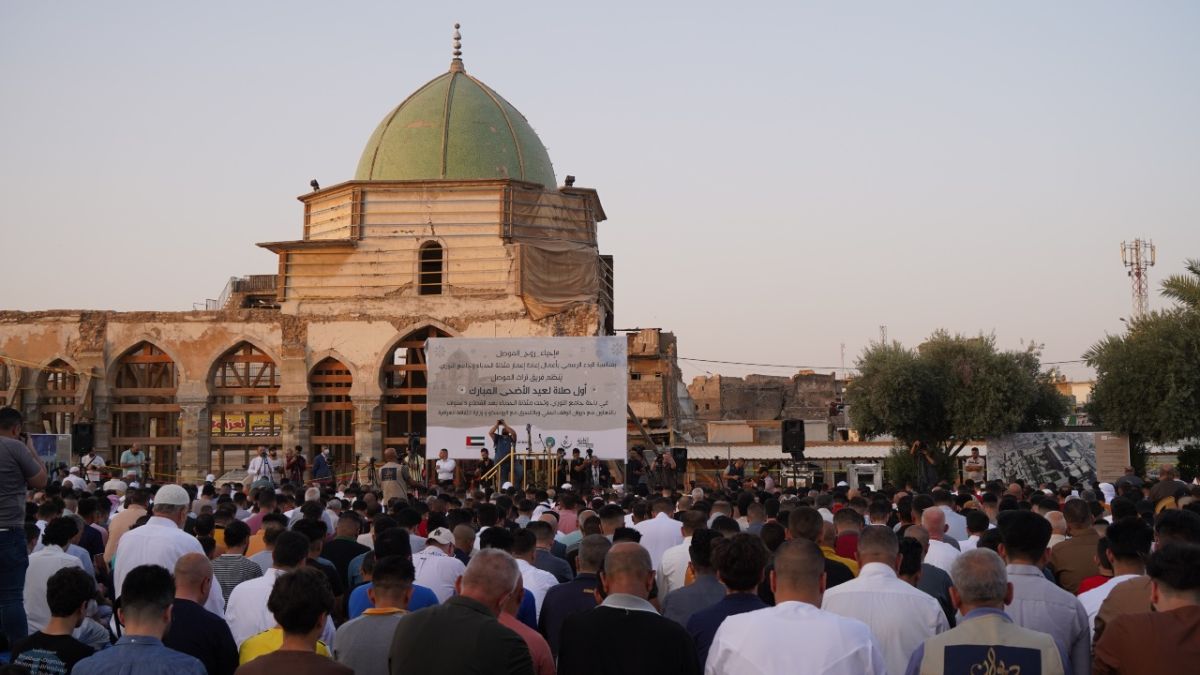 مبادرة إقامة صلاة العيد في الجامع النوري التي افتقدها السكان لسنوات اطلقها فريق تراث الموصل بمناسبة البدء الرسمي بأعمال إعمار منارة الحدباء وجامع النوري.