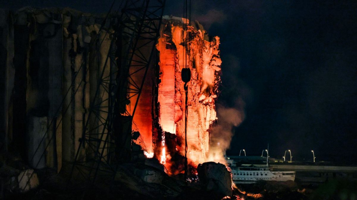 اندلعت النيران منذ مطلع الشهر الحالي في القسم المتصدّع من إهراءات الحبوب، المعرضة لخطر الانهيار جراء الأضرار الجسيمة التي خلّفها الانفجار، بسبب التخمّر مع ارتفاع نسبة الرطوبة داخل مخزون الحبوب المتبقي، وفق السلطات وخبراء.