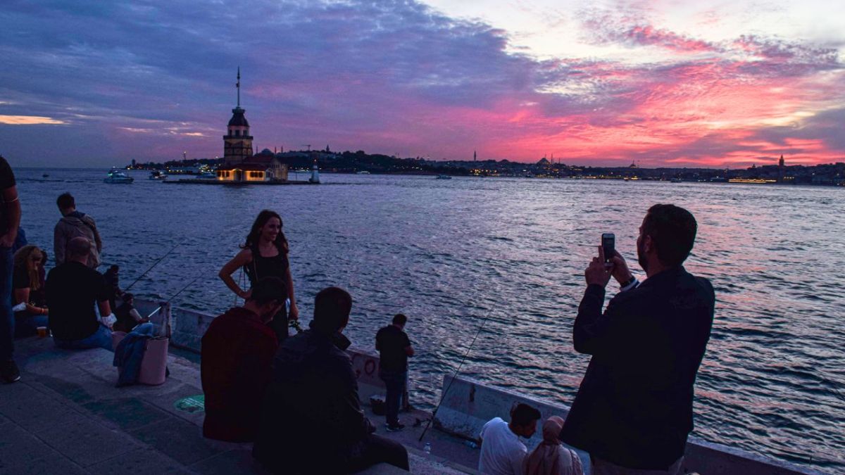 مجموعة من لاجئين سوريين وأشخاص من الأردن يلتقطون صور سيلفي تذكارية وسط تمثال أتاتورك في إسطنبول تركيا (أخبار الآن)