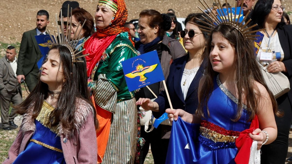 محتفلون يرتدون ملابس تقليدية يرفعون الأعلام الآشورية خلال احتفالات رأس السنة الآشورية “أكيتو” في مدينة دهوك، 1 نيسان 2023.