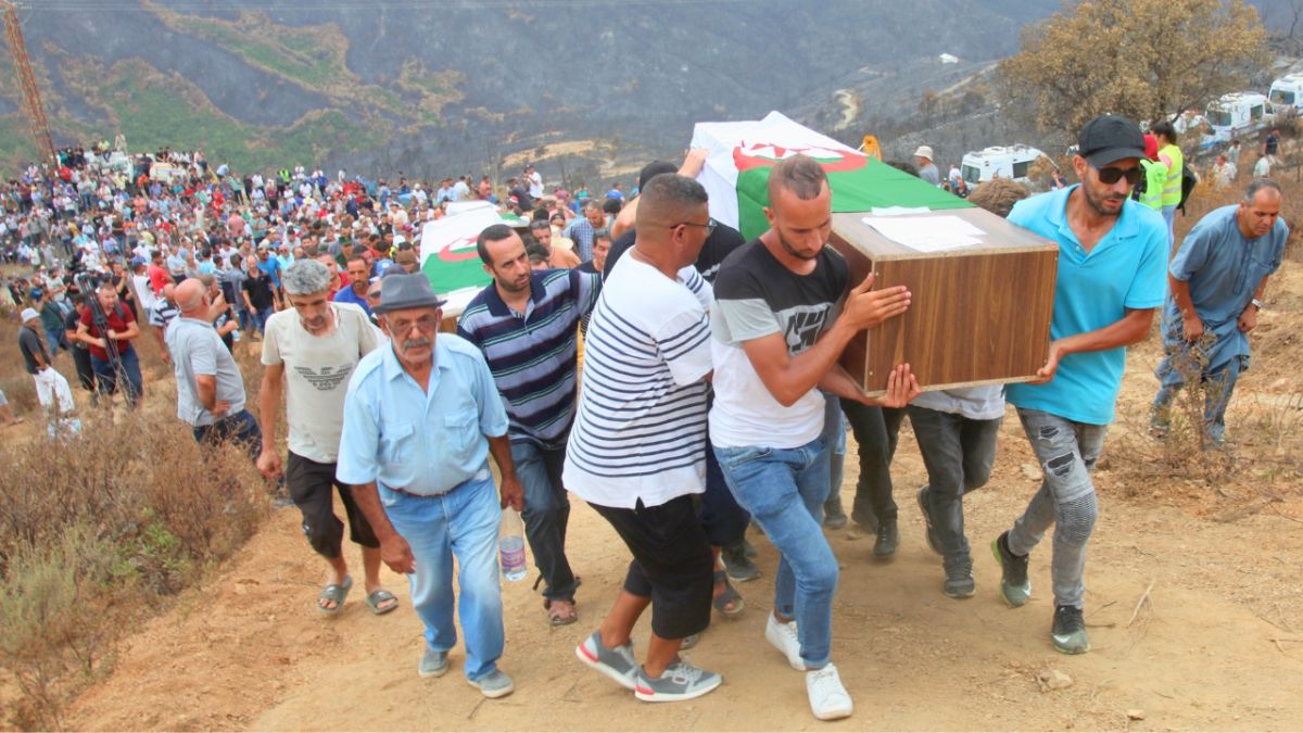 شيّع أهالي بجاية في الجزائر جثث 16 شخصاً من ضحايا الحرائق التي تسبب بمصرع 34 شخصاً على الأقل، وأسفرت عن أضرار مادية كبيرة.
