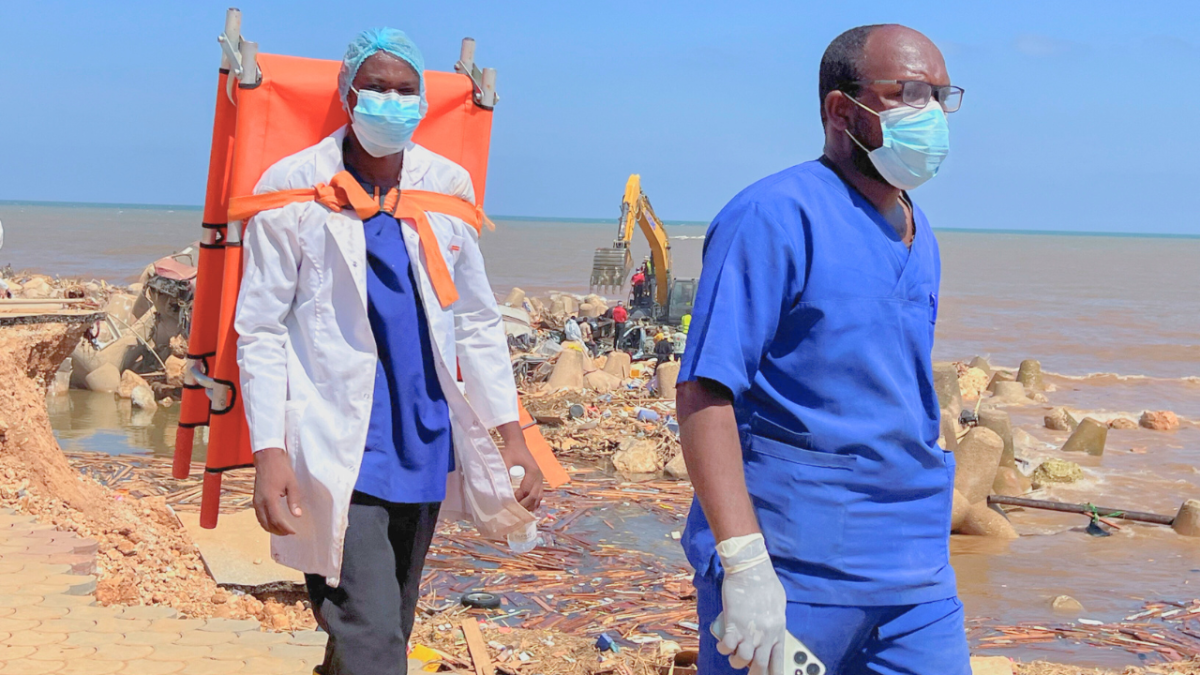 فرق البحث والإنقاذ تعمل في أعقاب الفيضانات بدرنة الليبية. (رويترز)