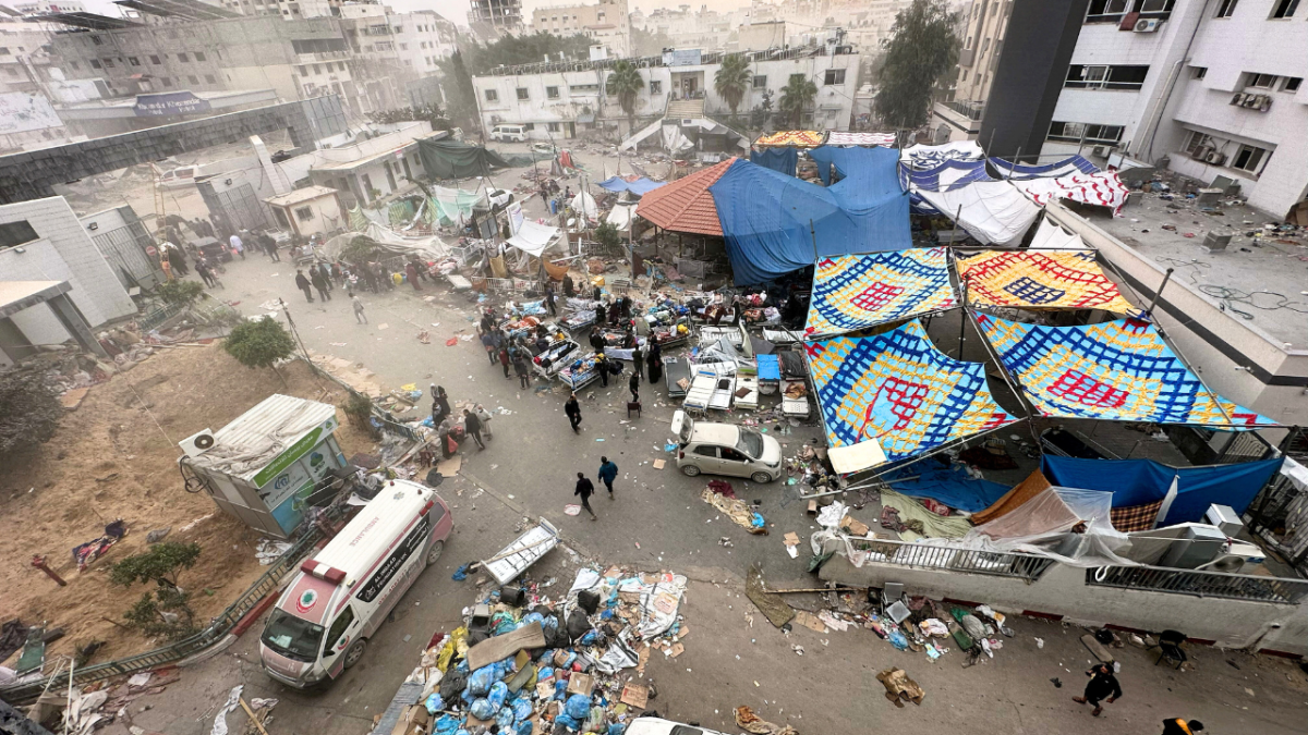 نصب نازحون دُمّرت منازلهم في شمال غزة مئات الخيام البدائية بين أكوام الأنقاض في مجمّع الشفاء الطبّي الذي خرج عن الخدمة بعدما حاصره الجيش الإسرائيلي واقتحمه في تشرين الثاني/نوفمبر.