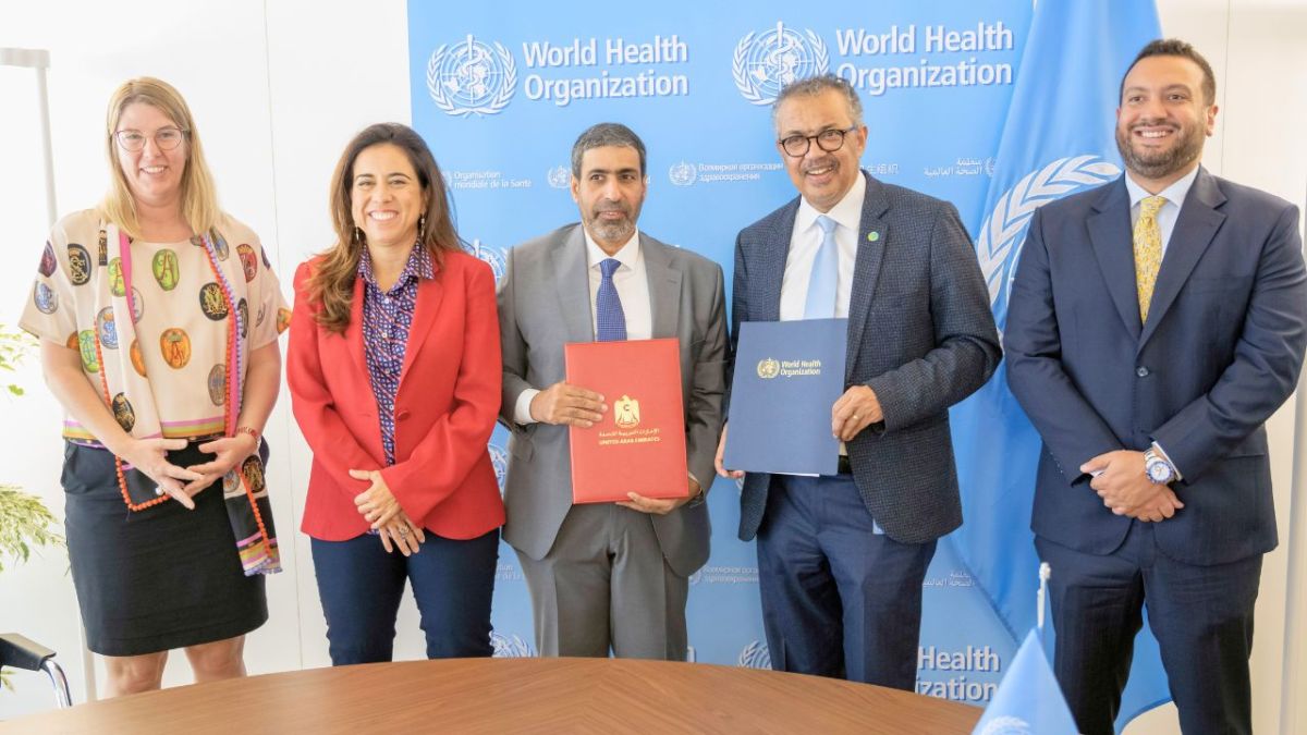 وقد وقع الاتفاقية، من جانب دولة الإمارات سلطان الشامسي، مساعد وزير الخارجية لشؤون التنمية والمنظمات الدولية، وعن منظمة الصحة العالمية المدير العام للمنظمة الدكتور تيدروس أدهانوم، وبحضور لانا زكي نسيبة مساعدة وزير الخارجية للشؤون السياسية، وذلك في مقر منظمة الصحة العالمية بجنيف.