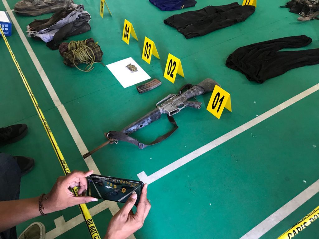 وأوضح رئيس المفتشين العام لشرطة منطقة وسط سولاويزي العام ، رودي سيفاهريادي أنه تمت مصادرة أدلة على شكل سلاح ناري من طراز M16 ، وحقيبتا ظهر، وقنبلة يدوية، وقنبلة وقود واحدة، وتسع ذخائر حية، وغيرها.