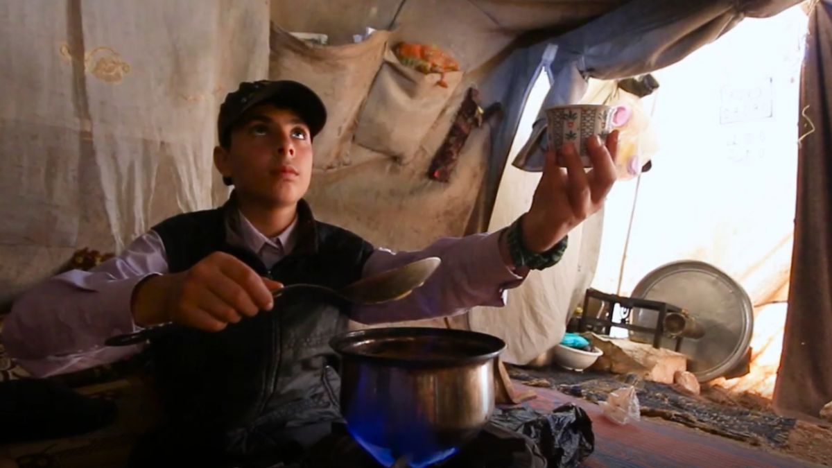 يذهب الطفل في الصباح إلى مدرسة المخيم في سوريا ثم يعود بعد العمل ليصنع القهوة المرة ويتنقل بين الخيام والمتاجر لبيعها حتى يوفر ضروريات حياة عائلته.