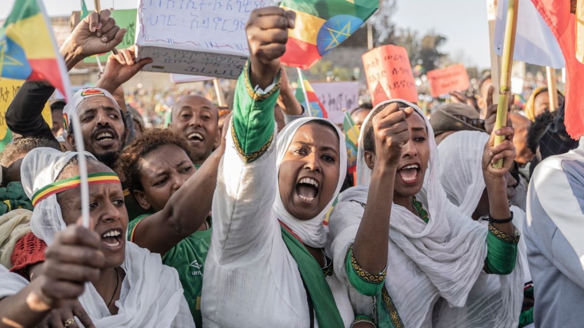 تجمع الناس في أديس أبابا ، إثيوبيا ، خلال مظاهرة لدعم القوات المسلحة الإثيوبية (أ ف ب)