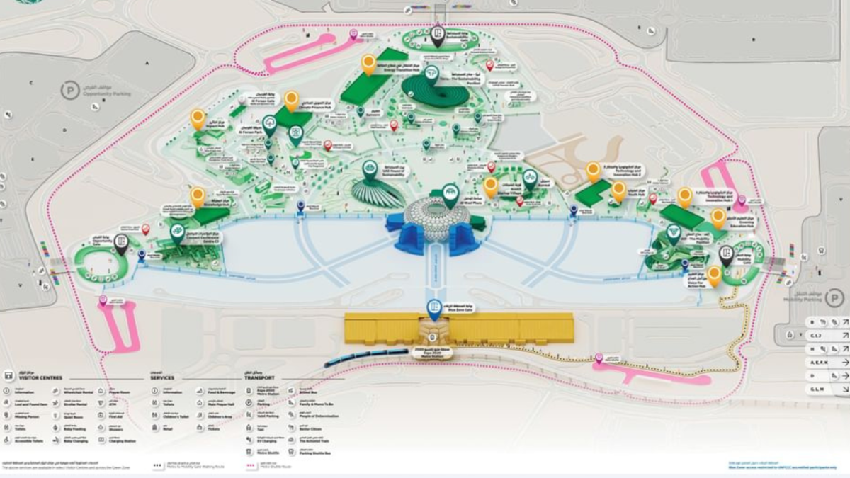 تدير دولة الإمارات، التي تتولى رئاسة المؤتمر، المنطقة الخضراء التي تم تصميمها لتعزز التكامل مع المنطقة الزرقاء وقدرة الزوار على التفاعل والمشاركة.