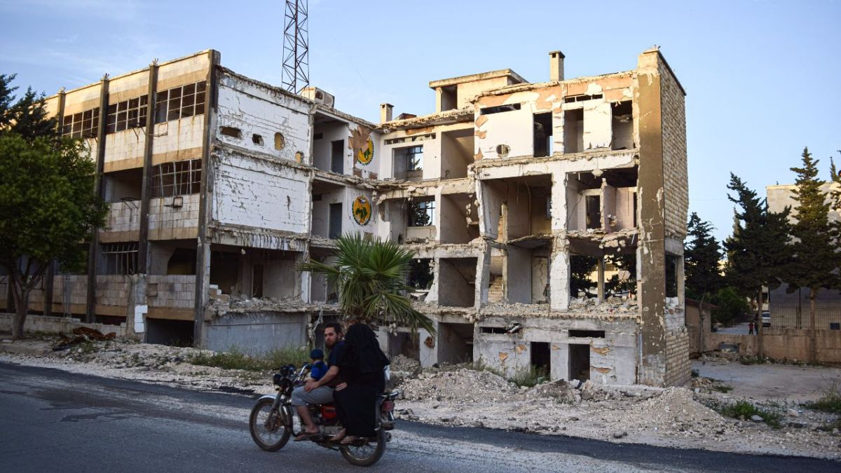 كتب على جدران هيئة تحرير الشام باقية..المبنى مهدم بالكامل