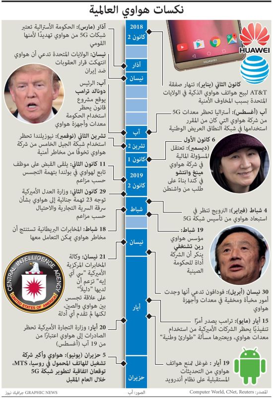 – 21 نيسان/أبريل 2019: وكالة المخابرات المركزية الأمريكية “cia” تعلن أن لديها دليلاً على علاقة تجسس بين هواوي والصين.