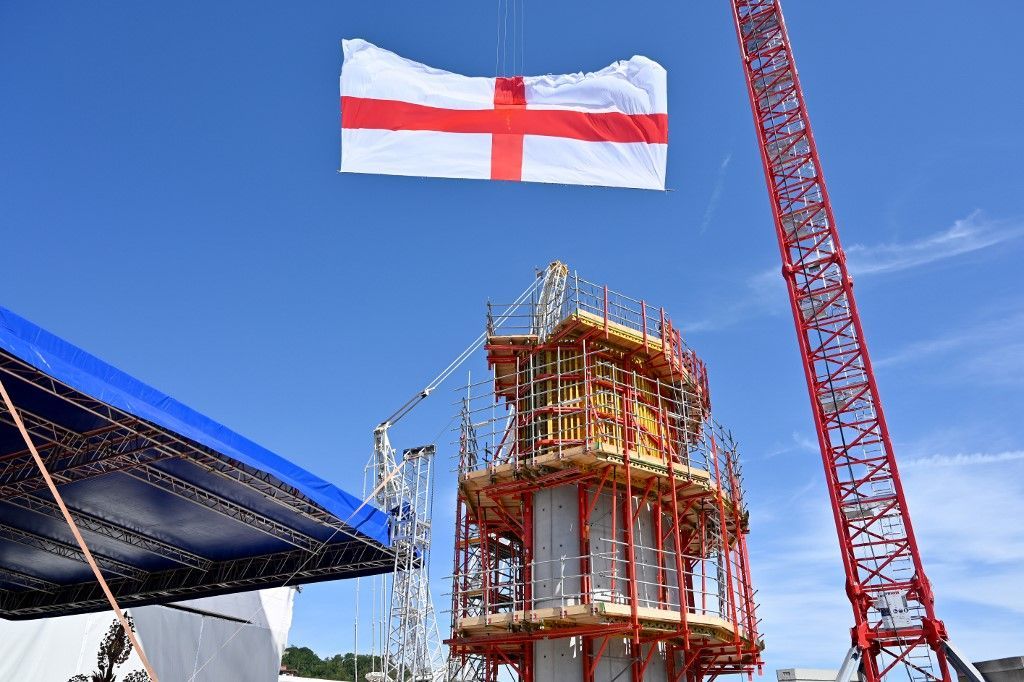 في موقع الحادث حيث لا تزال الأنقاض متناثرة، أجريت المراسم على بعد عشرين متراً من حيث بدأ بناء أول قسم من الجسر الجديد.