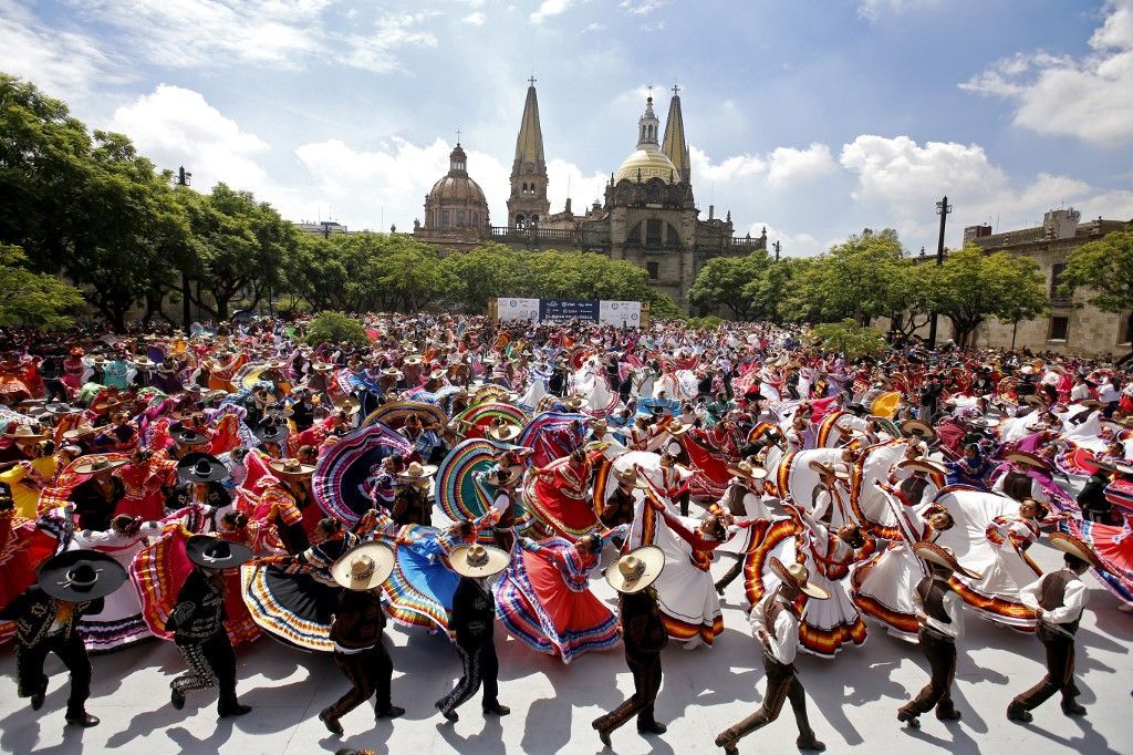 وقد تجمّع الراقصون، وهم أغلبيتهم من مدارس الرقص الفلكلوري، تحت أشعّة الشمس الحارقة في ساحة التحرير في وسط غوادالاخارا عاصمة ولاية خاليسكو.