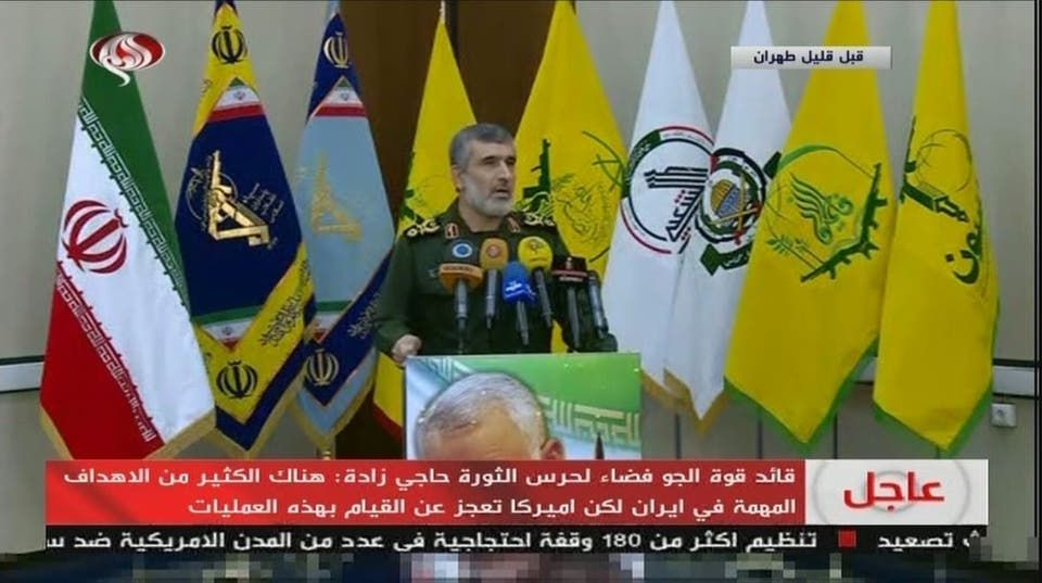 وظهر أمير علي حاجي زادة، قائد القوة الجوفضائية التابعة للحرس الثوري واقفاً وخلفه أعلام ميليشيات مثل حزب الله اللبناني، وأنصار الله ” الحوثي”، و حماس الفلسطينية والحشد الشعبي العراقية.