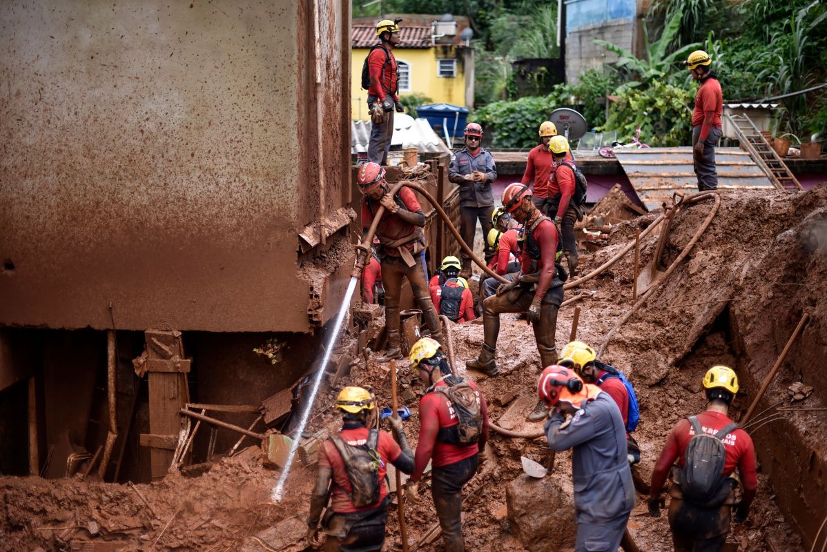 عمال الإنقاذ يبحثون في موقع انهيار طيني ، بعد هطول أمطار غزيرة في حي فيلا المثالي في بيلو هوريزونتي بولاية ميناس جيرايس