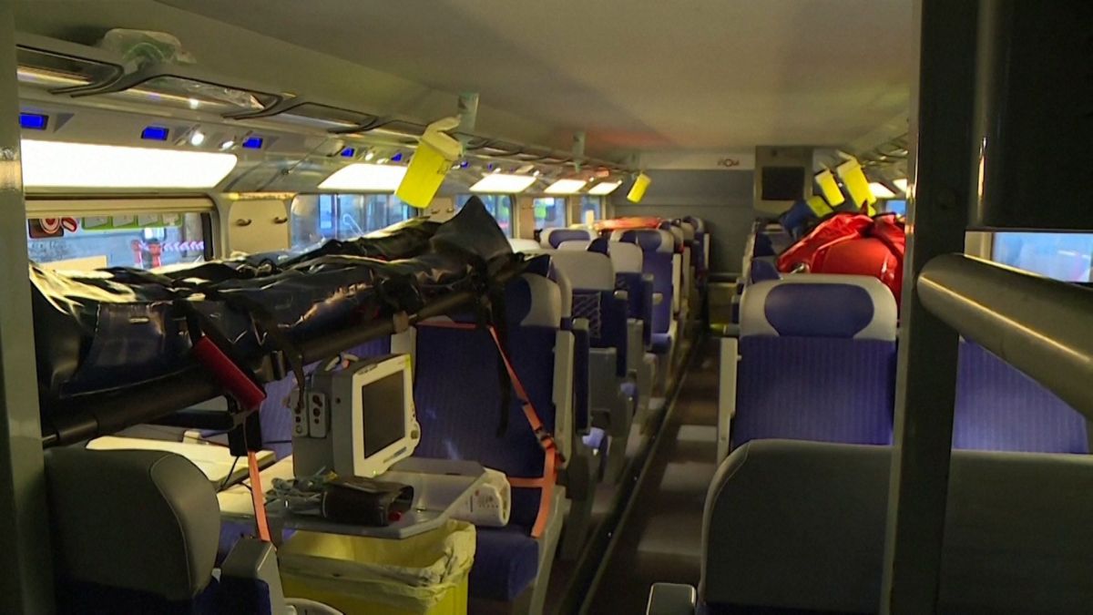 وعملية الإجلاء بالقطار السريع الأولى من نوعها في أوروبا، تم خلالها تحويل عربات إلى وحدات عناية مركزة قادرة على استيعاب 4 مرضى و6 من أفراد الطواقم الطبية في كل مقصورة