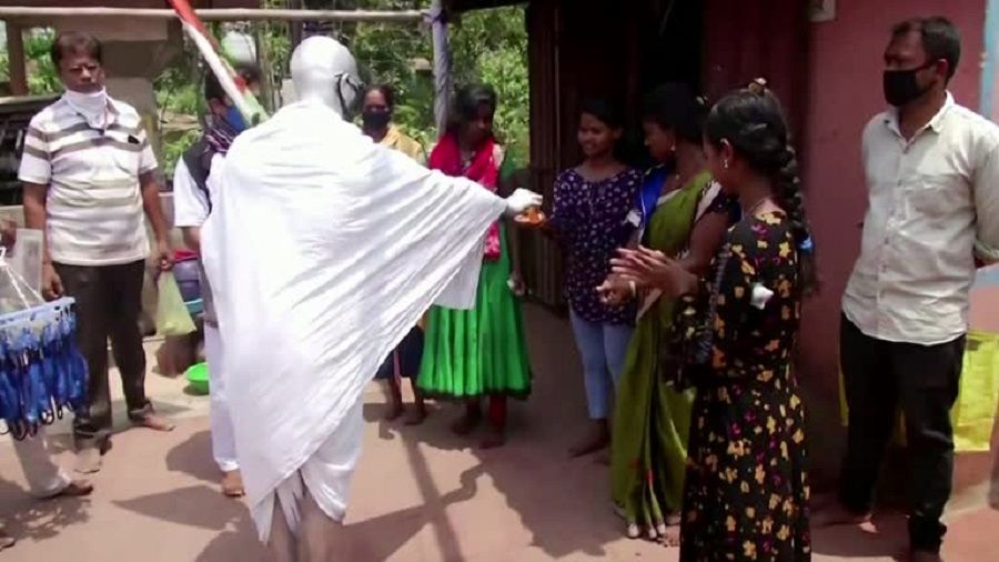 ارتدى فنان في مدينة بوبانسوار في الهند، لباس يشبه مقاتل الحرية الشهير “مهاتما غاندي” في محاولة لرفع مستوى الوعي حول فيروس كورونا المستجد ولحث السكان على البقاء في منازلهم.