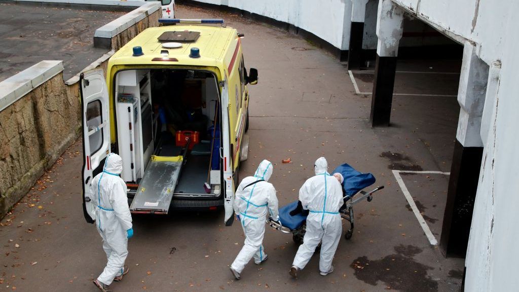 الأطباء المتخصصون ينتظرون بجوار سيارات الإسعاف بالقرب من مستشفى ألكساندروفسكايا في سانت بطرسبرغ / رويترز