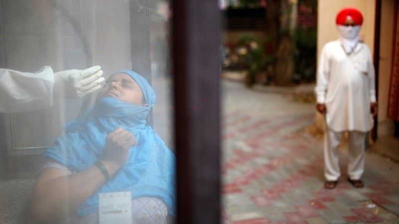 عاملة رعاية صحية تجمع مسحة وسط انتشار مرض فيروس كورونا في مركز اختبار، في نيودلهي، الهند/ رويترز