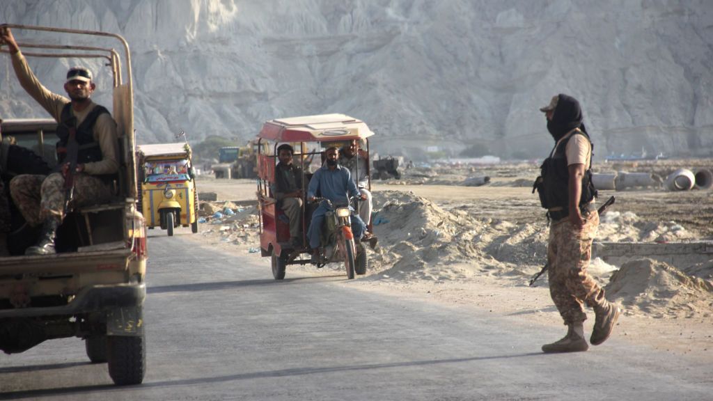 جنود باكستانيون يتخذون إجراءات أمينة عند مدخل ميناء جوادار في بلوشستان