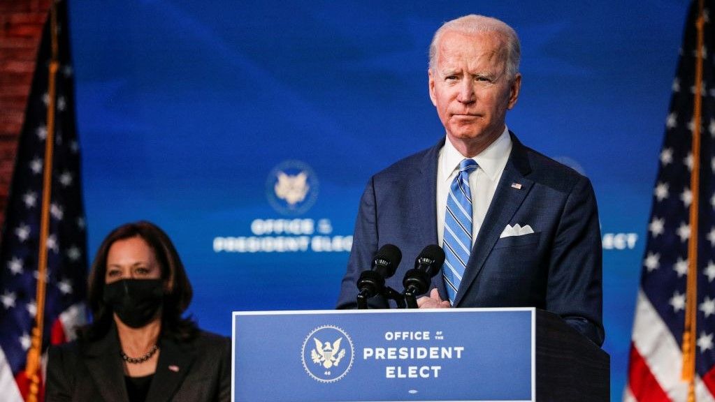 الرئيس الأمريكي المنتخب جو بايدن يلقي ملاحظات بينما تنظر نائب الرئيس المنتخب كامالا هاريس خلال خطاب متلفز حول الأزمات الاقتصادية والصحية الحالية في مسرح كوين في ويلمنغتون ، ديلاوير. رويترز