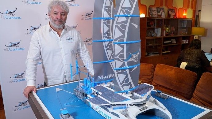 القبطان الفرنسي السويسري ومؤسس منظمة “SeaCleaners” غير الحكومية، إيفان بورجنون، يقف بجانب نموذج “مانتا”، وهو قارب إبحار عملاق سيجمع النفايات البلاستيكية العائمة في المحيطات ويعيد تدويرها، في باريس فرنسا/ رويترز