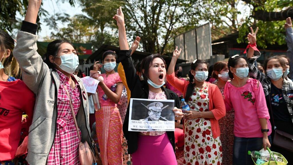 وردد المتظاهرون هتافات مناهضة للانقلاب العسكري ودعمًا للزعيمة أونغ سان سو تشي.