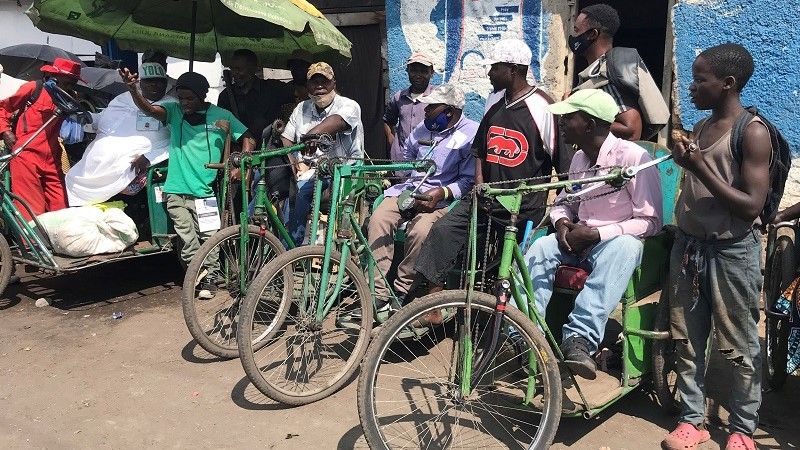 ساعي معاق يركب دراجة ثلاثية العجلات كبيرة الحجم محملة بأكياس البقالة في المنطقة المحايدة وسط تفشي مرض فيروس كورونا بين رواندا والكونغو في غوما، جمهورية الكونغو الديمقراطية/ رويترز