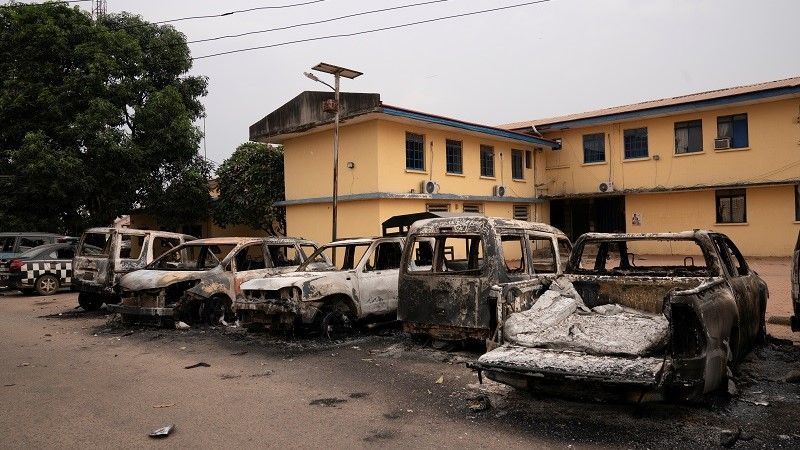 شوهدت مركبات محترقة خارج مقر قيادة ولاية إيمو التابعة لقوة الشرطة النيجيرية بعد أن هاجم مسلحون وأضرموا النار في ممتلكات في ولاية إيمو ، نيجيريا/ رويترز