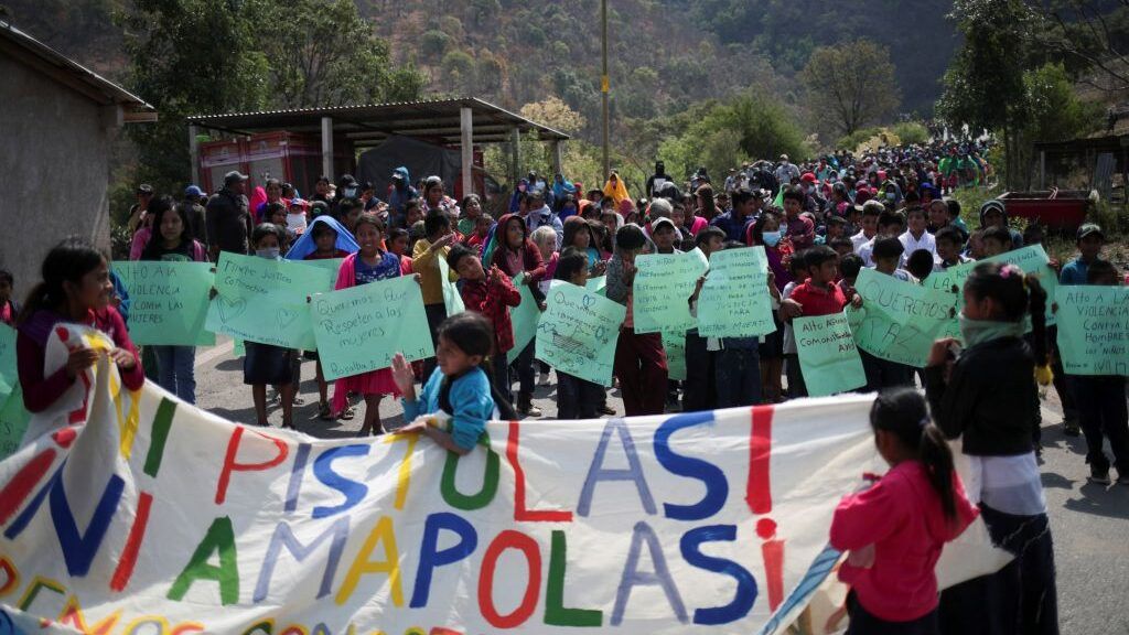 في محاولة منهم للتعبير عن غضبهم مما يحدث خرج الأطفال، وهم يحملون بالونات ولافتات محلية الصنع، في شوارع قرية مكسيكية مرددين شعارات ودعوا إلى السلام في منطقة تمارس فيها عصابات المخدرات العنف والجريمة.