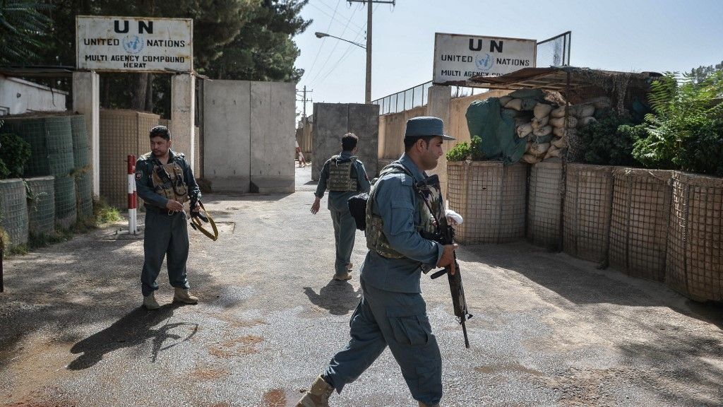 عناصر الأمن يحمون مجمع مكاتب بعثة الأمم المتحدة في أفغانستان في منطقة غوزارا بمقاطعة هرات ، 31 يوليو 2021 / أ ف ب