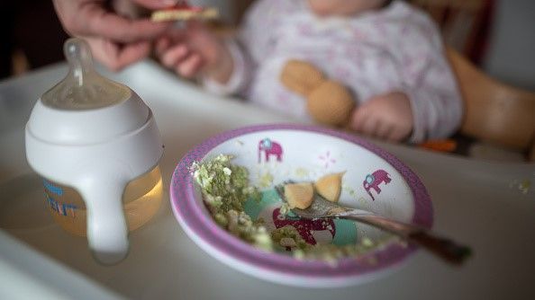 طفلة تبلغ حوالي 10 أشهر تتناول وجبتها