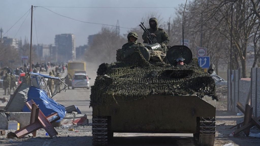 عناصر من القوات الموالية لروسيا فوق دبابة على مشارف مدينة ماريوبول الساحلية الجنوبية المحاصرة. رويترز