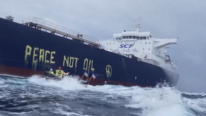 كتب نشطاء من منظمة السلام الأخضر الإيطالية رسالة “السلام وليس النفط” بأحرف كبيرة على جانب ناقلة نفط خام روسية، كجزء من جهود حث الحكومات الأوروبية على التوقف عن استخدام الوقود الأحفوري.