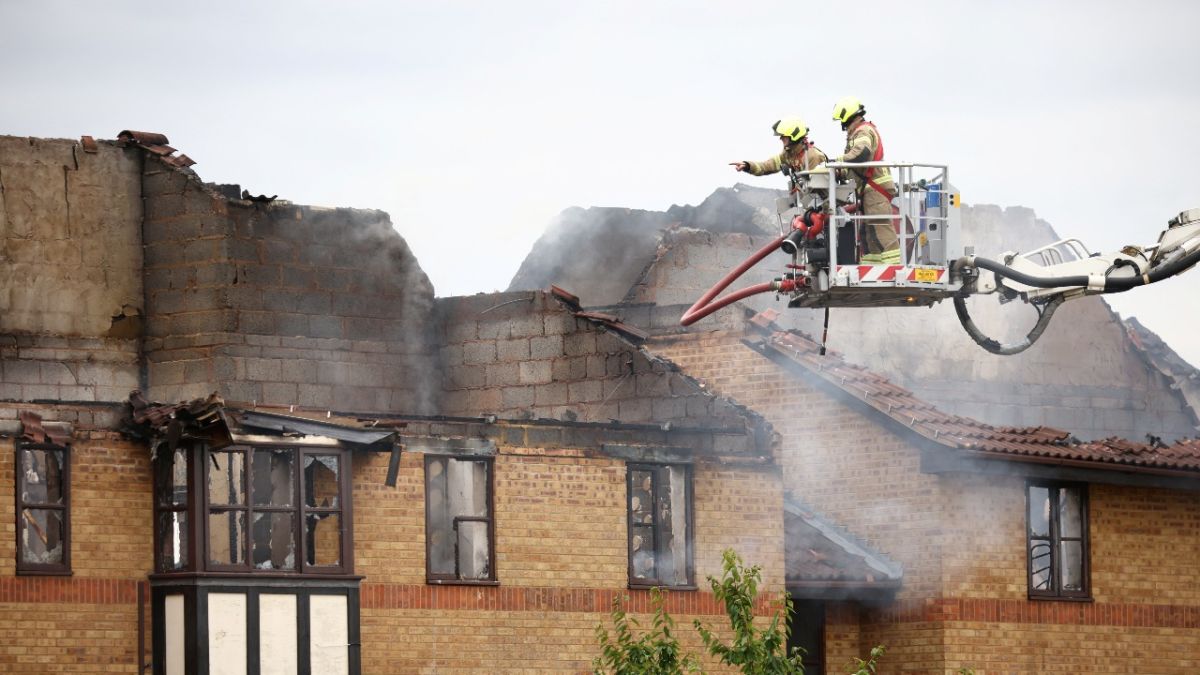 ويبدو في الصورة رجال إطفاء ممدّدين على الأرض على مقربة من سياراتهم، ويبدو دخان حرائق في الأفق.